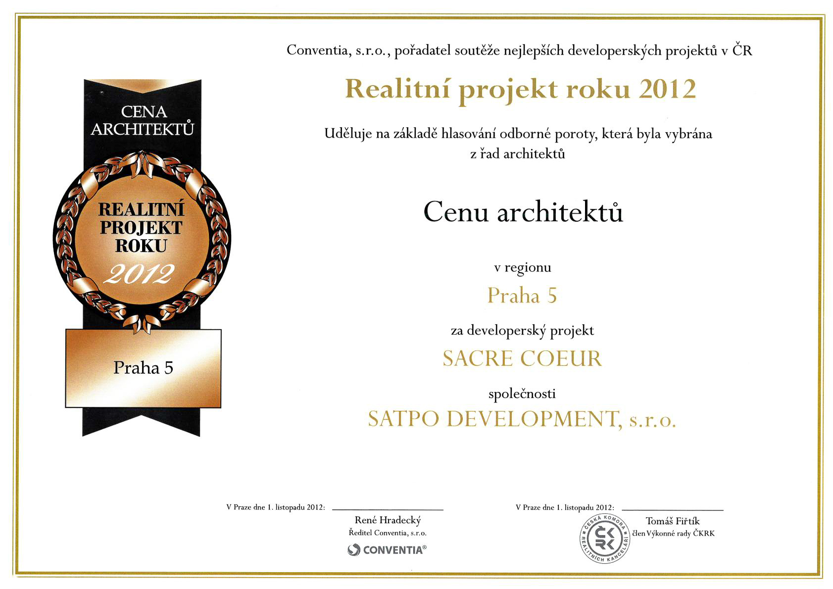 The results of the “Real Estate Award of the Year 2012” contest were declared at the Realty Congress 2012 on 1 November 2012. The company SATPO was awarded the Architects Award of the Prague 5 Region by the professional jury for its development project of the Sacre Coeur Residence.