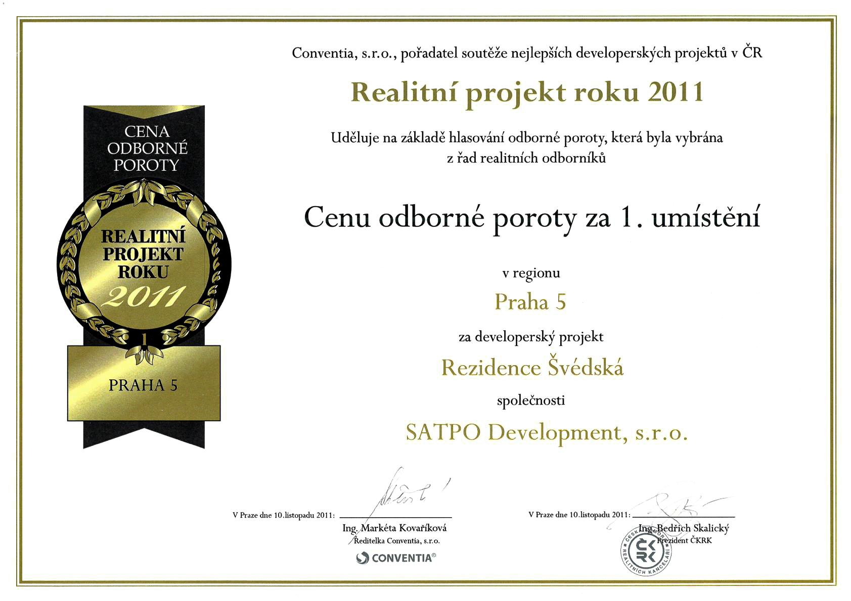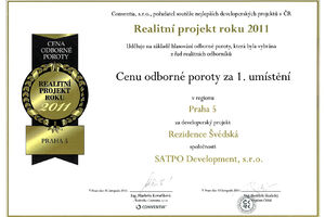 Rezience Švédská won 1st place in the competition category Expert Jury Award within the new competition Real Estate Project of the Year 2011 among objects realized in the Prague 5 district.