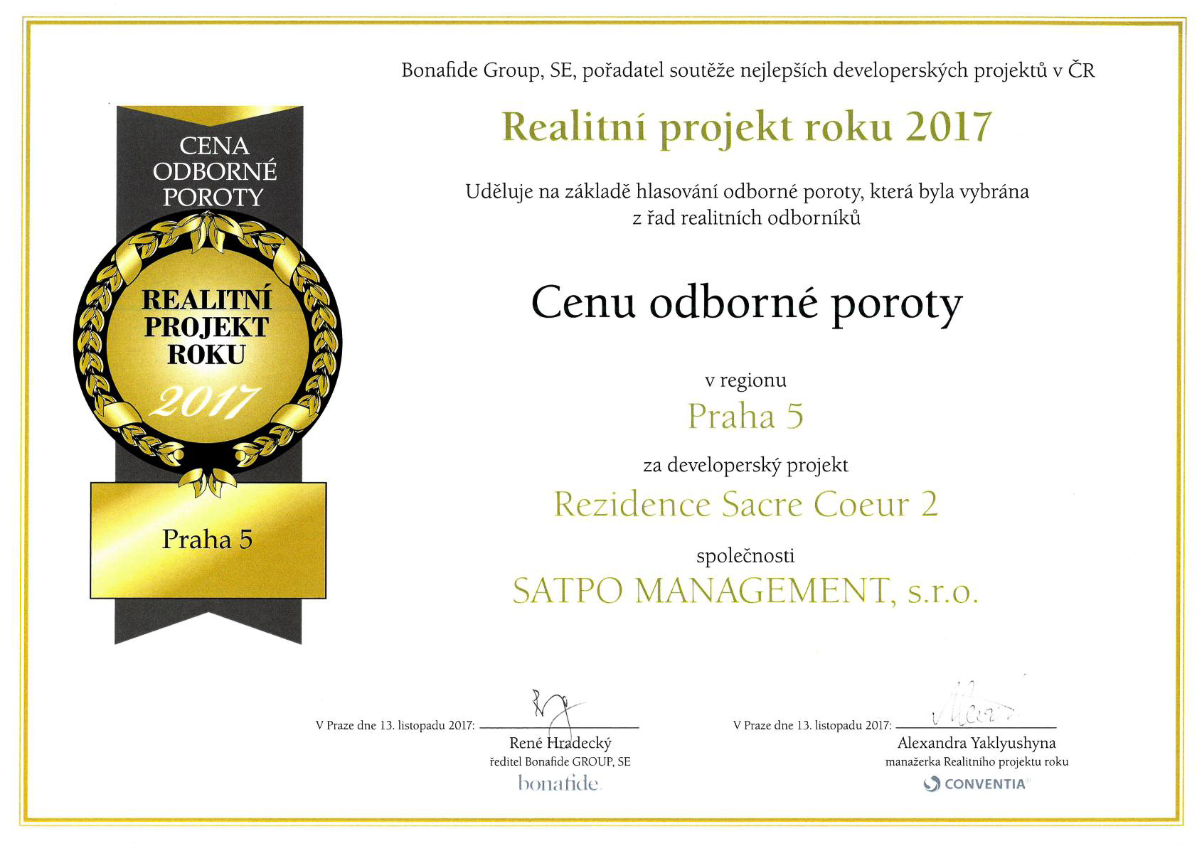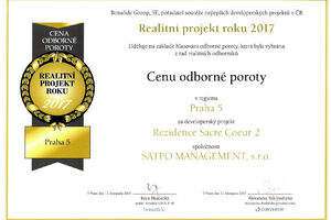 As part of the Real Estate Congress 2017, the results of the "Real Estate Project of the Year 2017" competition were announced on 11/13/2017 in individual categories, and the SATPO company won the prize of the expert jury in the Prague 5 region for the registered development project Rezidence Sacre Coeur 2
