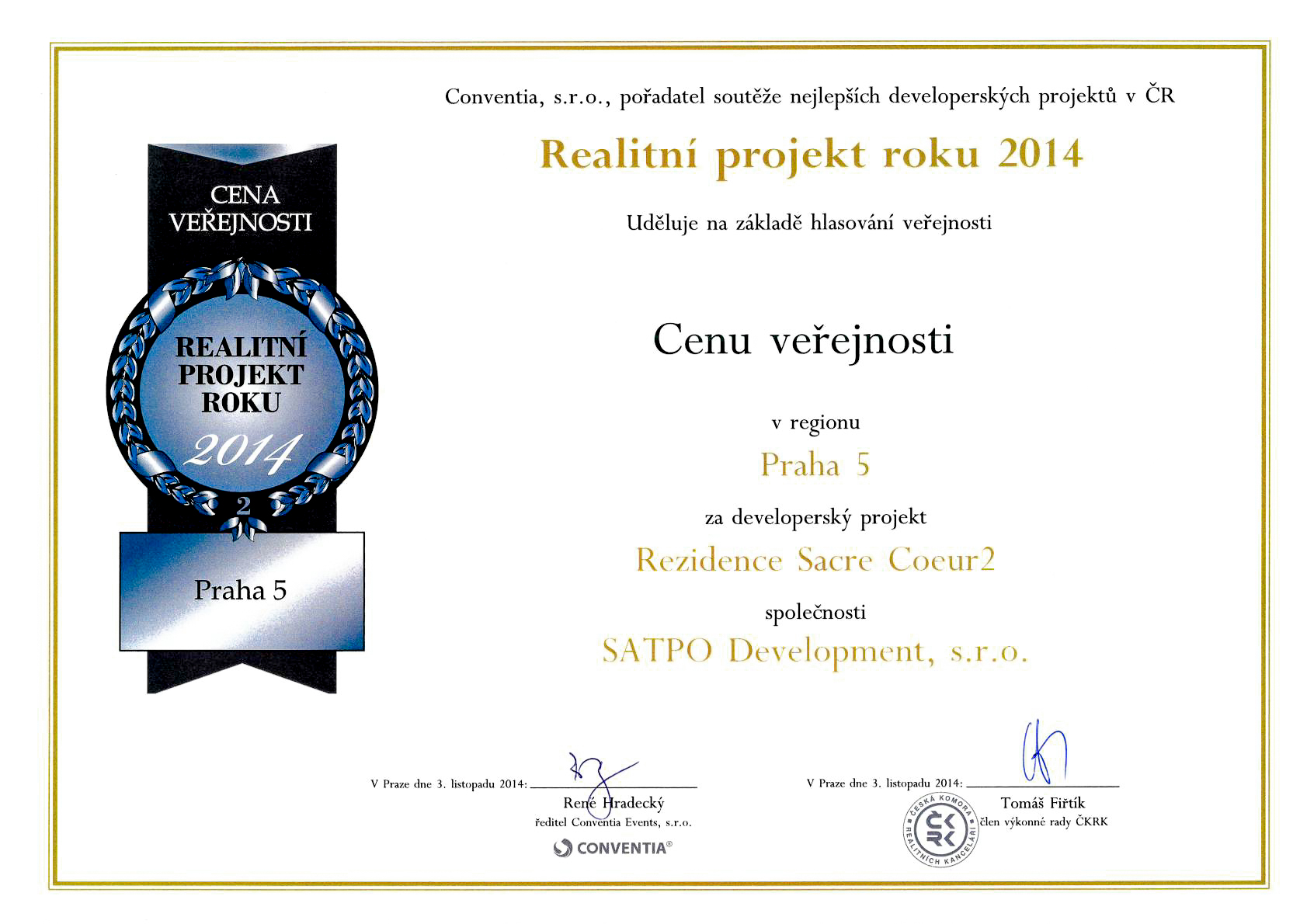 At the end of the Real Estate Congress hold on 3rd of November 2014 there were announced the results of the "Czech Real Estate Award 2014' and the company SATPO won two awards for the residential project Rezidence Sacre Coeur 2 as of the Prize of the Professional Jury and the Public Award at the Prague 5 region.