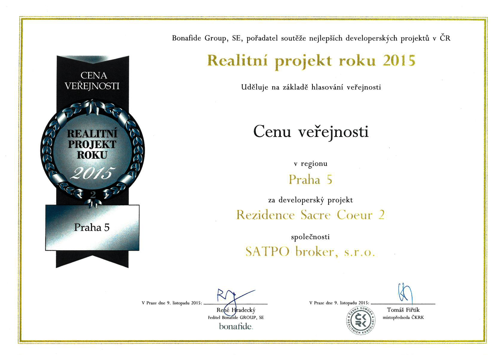 At the end of the Real Estate Congress hold on 9th of November 2015 there were announced the results of the Czech Real Estate Award. The company SATPO won the award for the residential project Sacre Coeur 2 as of the prize of the Public Award at the Prague 5 region.