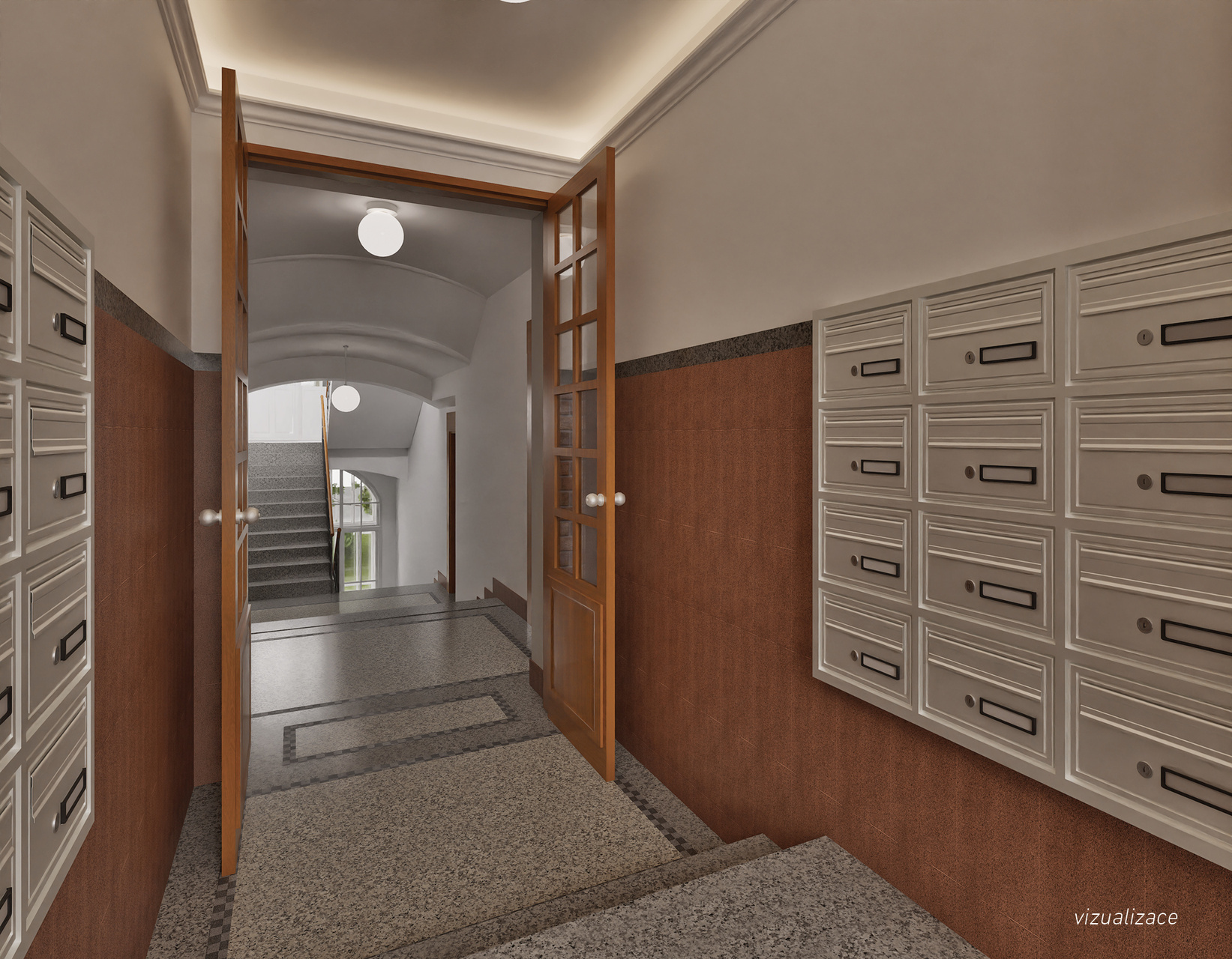 The house is currently undergoing a sensitive reconstruction of the common areas, which combines the preservation of the historical character with elements of modern comfort. All technical wiring will be renewed, the main entrance will be modified and a new glass elevator will be installed on the rear facade. The garden will be completely revitalized - a pergola, new paths and greenery will be added.