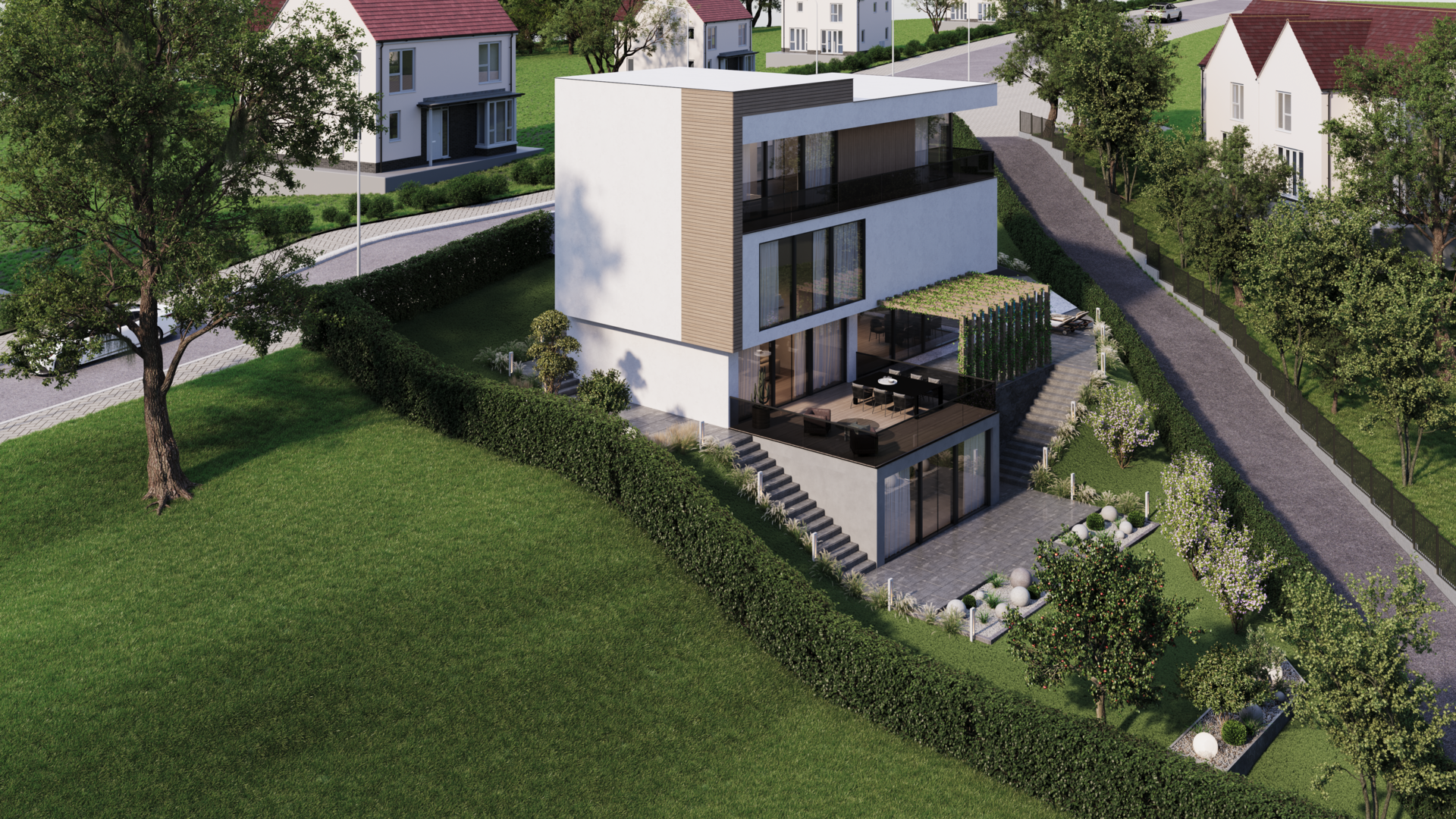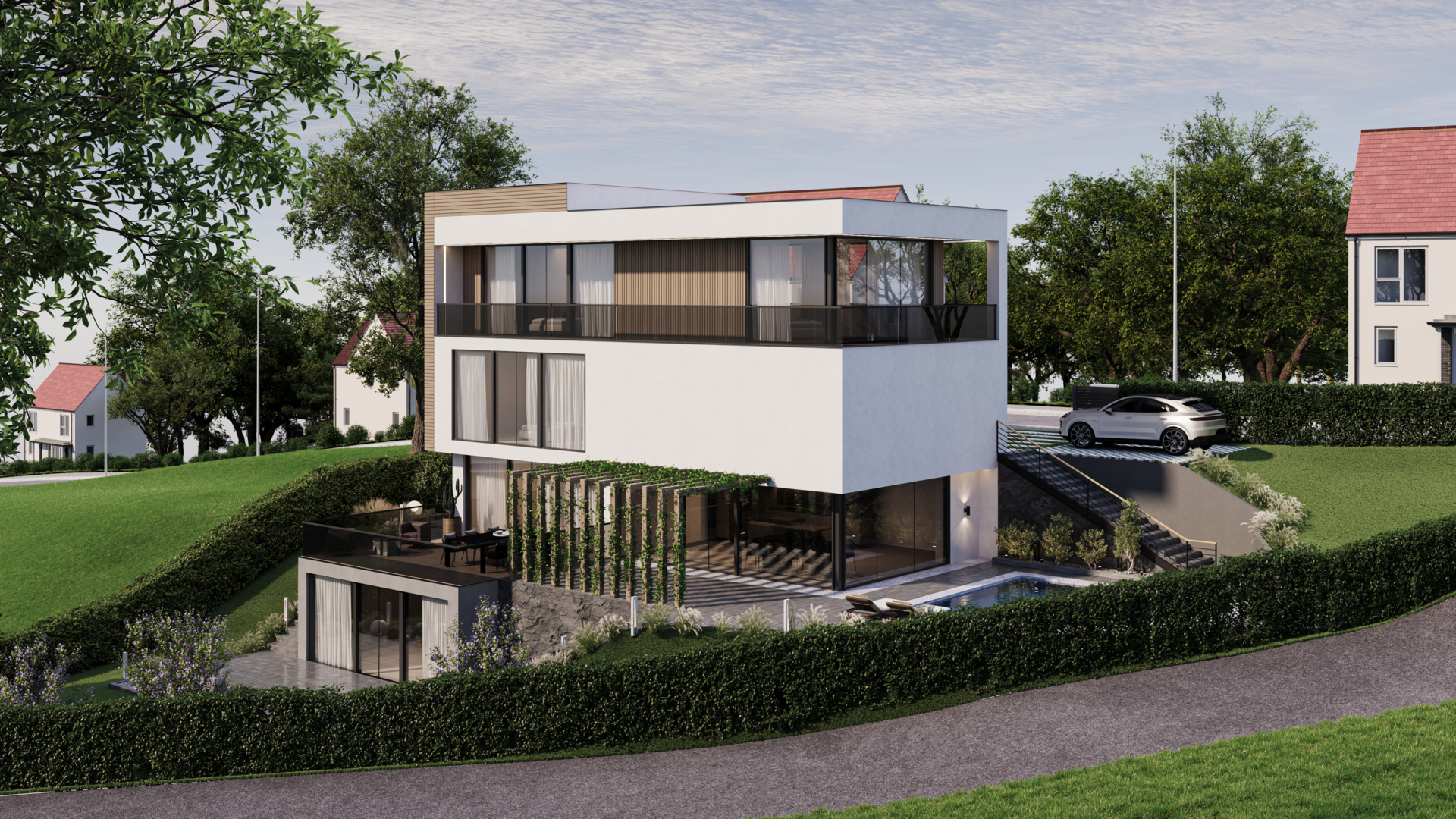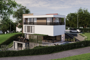 The conceptual design of the family house serves as inspiration for future construction, respecting the surrounding environment and bringing a modern luxurious lifestyle. The main entrance to the villa can be accessible directly from Nad Turbovou street, ensuring convenience and privacy for residents. Moreover, due to the sloping terrain, the conceptual design is tailored to provide maximum privacy in the social zone, which includes the living room, kitchen, and direct access to the pool and garden. The villa space offers a magnificent view of the surrounding landscape, providing a sense of peace and harmony with nature. Rooms with views to the east and north directions of Prague's city center will also be available, guaranteeing unforgettable experiences every day. Take a look at the conceptual villa visualization here; the actual villa can be tailored to the client's taste and preferences.