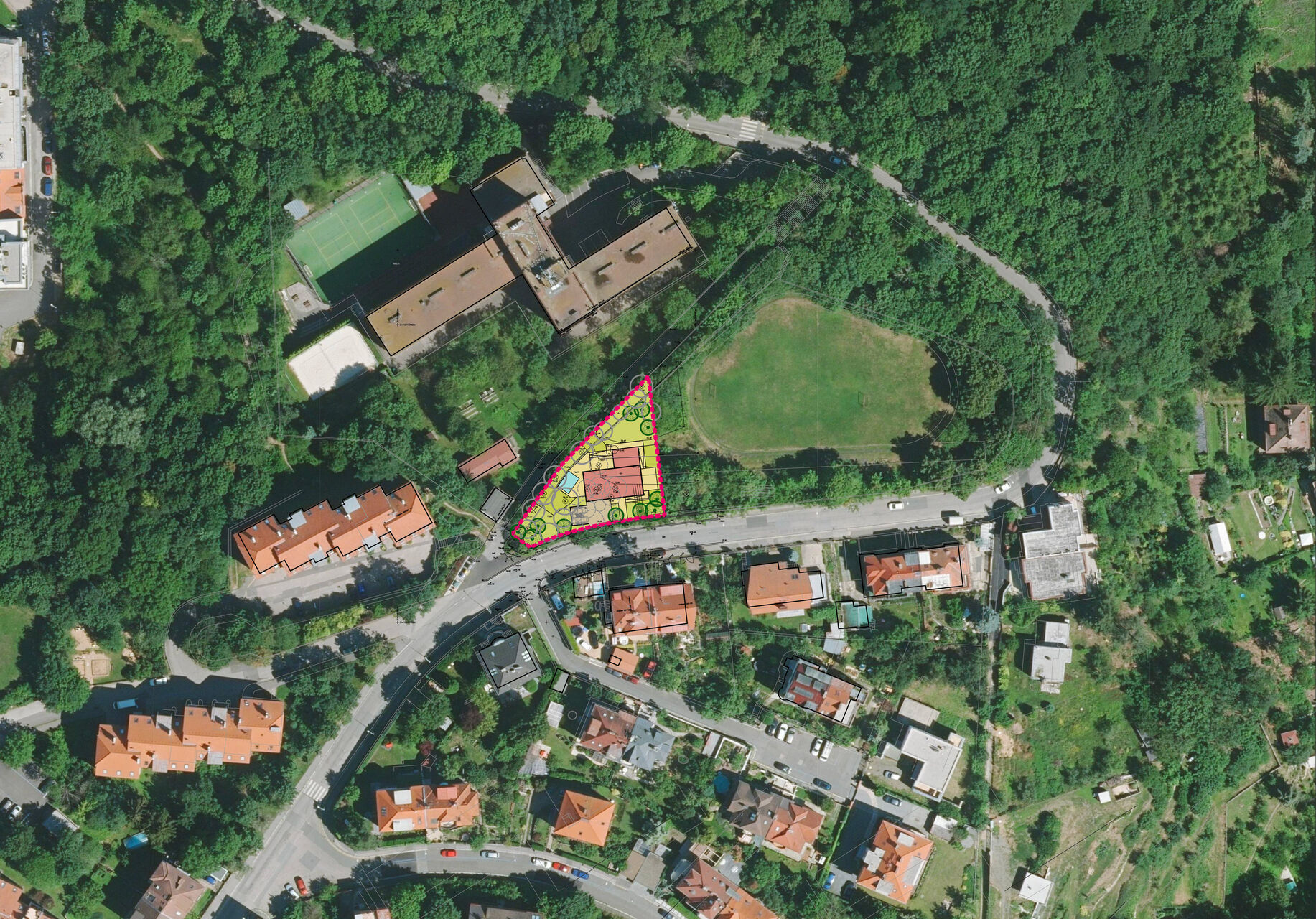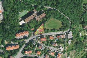 The building plot, covering an area of 882 m2, is located on the northern slope sloping down to the valley of the Motolský stream. Its irregular triangular shape brings interesting possibilities for architectural creativity. Nearby are public utility networks and a bus stop with direct connections to Smíchov and metro B, Anděl station, ensuring easy access to the city center and other parts of the city.