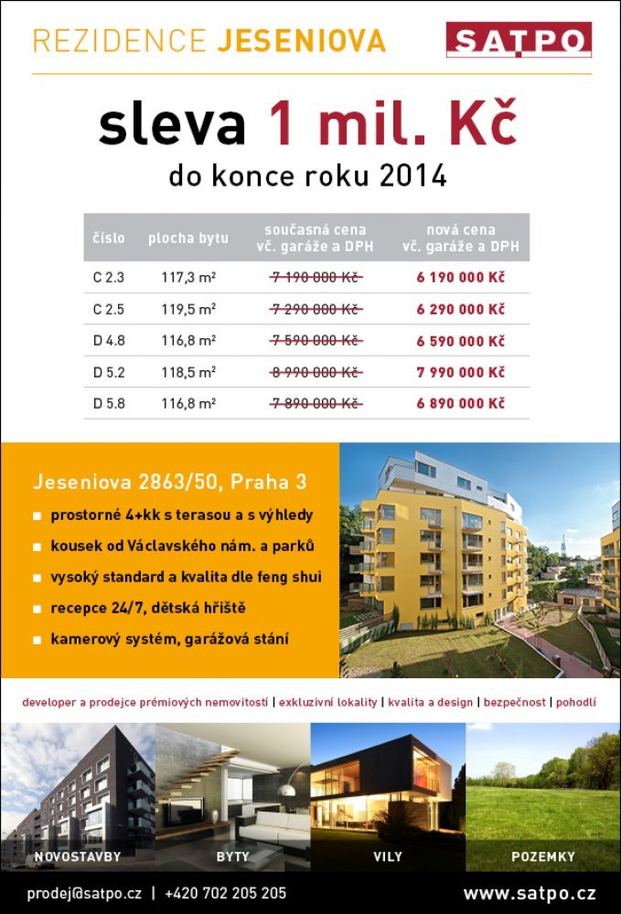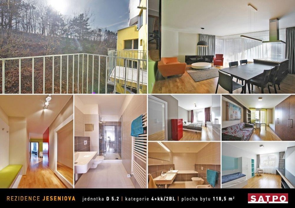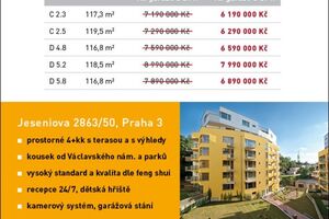 Take advantage of attractive offers on the purchase of housing units with 4 + room apartments in Residence JESENIOVA with a discount of CZK 1.000.000, -! We have last 5 available apartments with area ranging from 116 to 120 square meters in Jeseniova street in Prague 3. Each apartment has a spacious terrace or balcony with a view at the park Parukářka or at the center of Prague. The layouts as well as the entire Residence is built in harmony with nature, according to "feng shui" and meets all the requirements of modern architecture, there is 24/7 concierge, CCTV, playground and ample parking space. For more information, contact our sales consultant or write to prodej@satpo.cz.