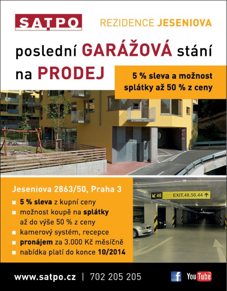 Take the advantage of our 5% discount when buying a garage in the JESENIOVA Residence, street Jeseniova 2863/50 in Prague 3. Together with this special offer, we also offer the option to pay in installments of up to 50% off. We have 8 parking spaces left and the offer is valid until the end of October 2014! For more information contact our sales team SATPO.