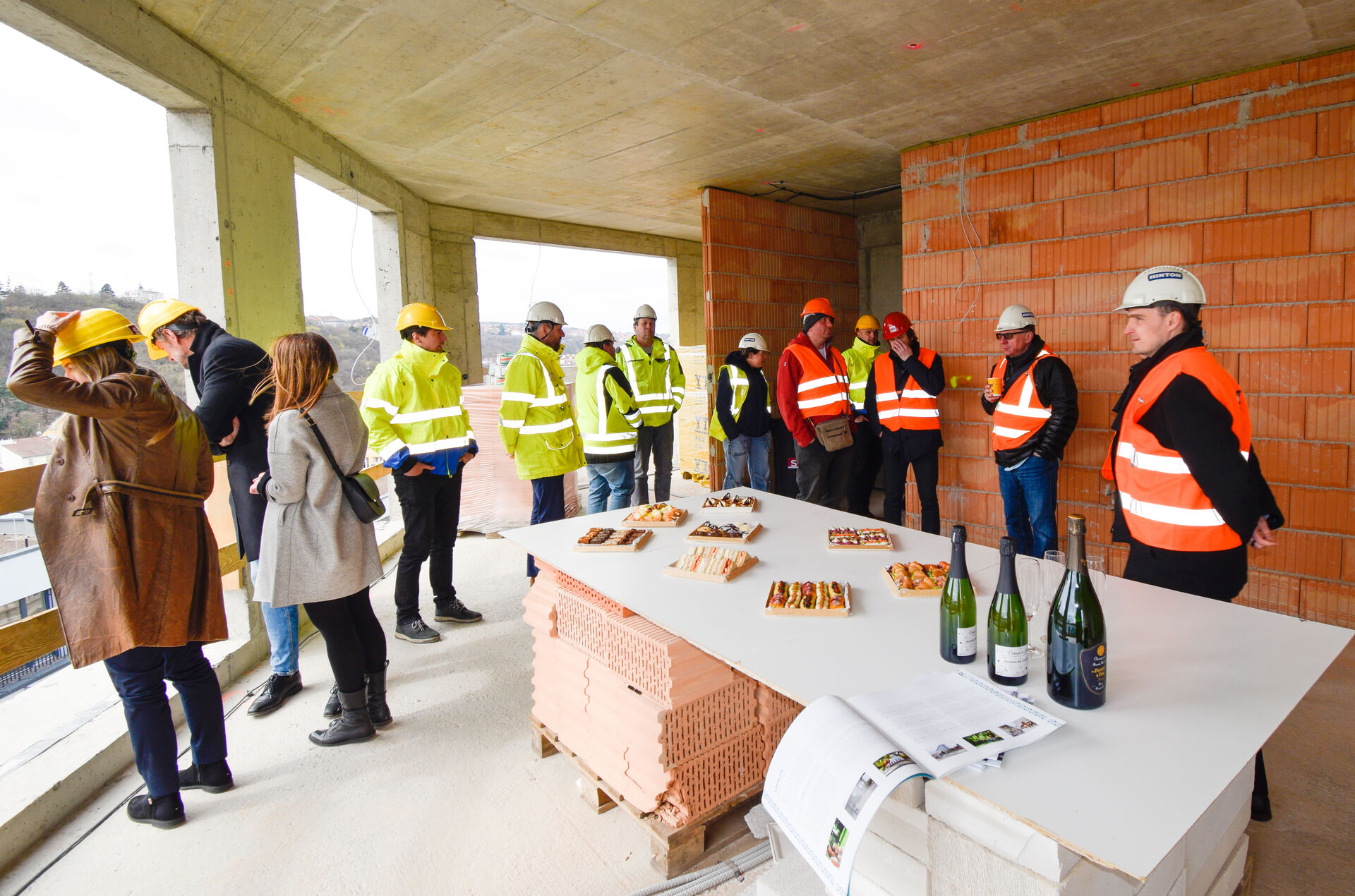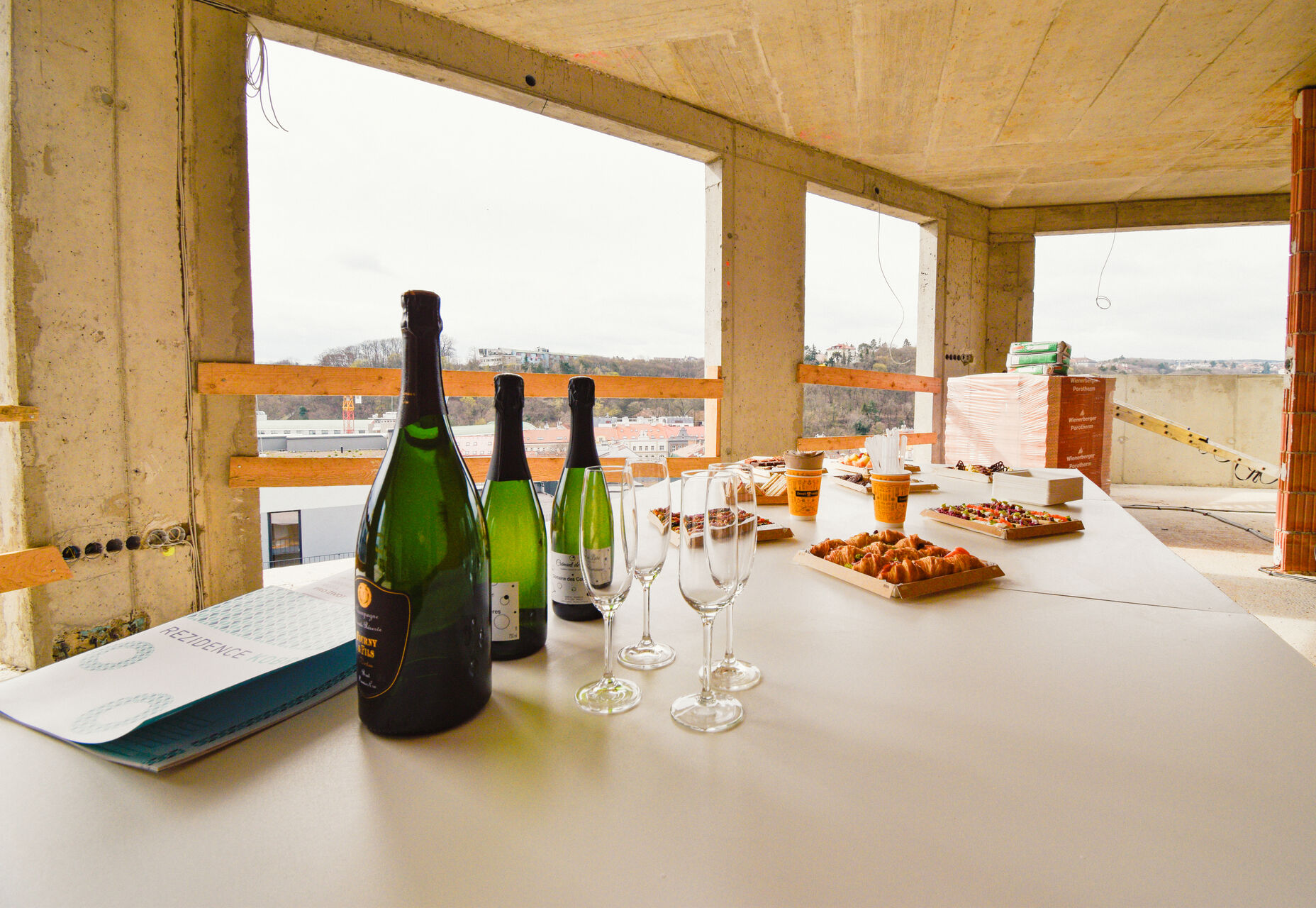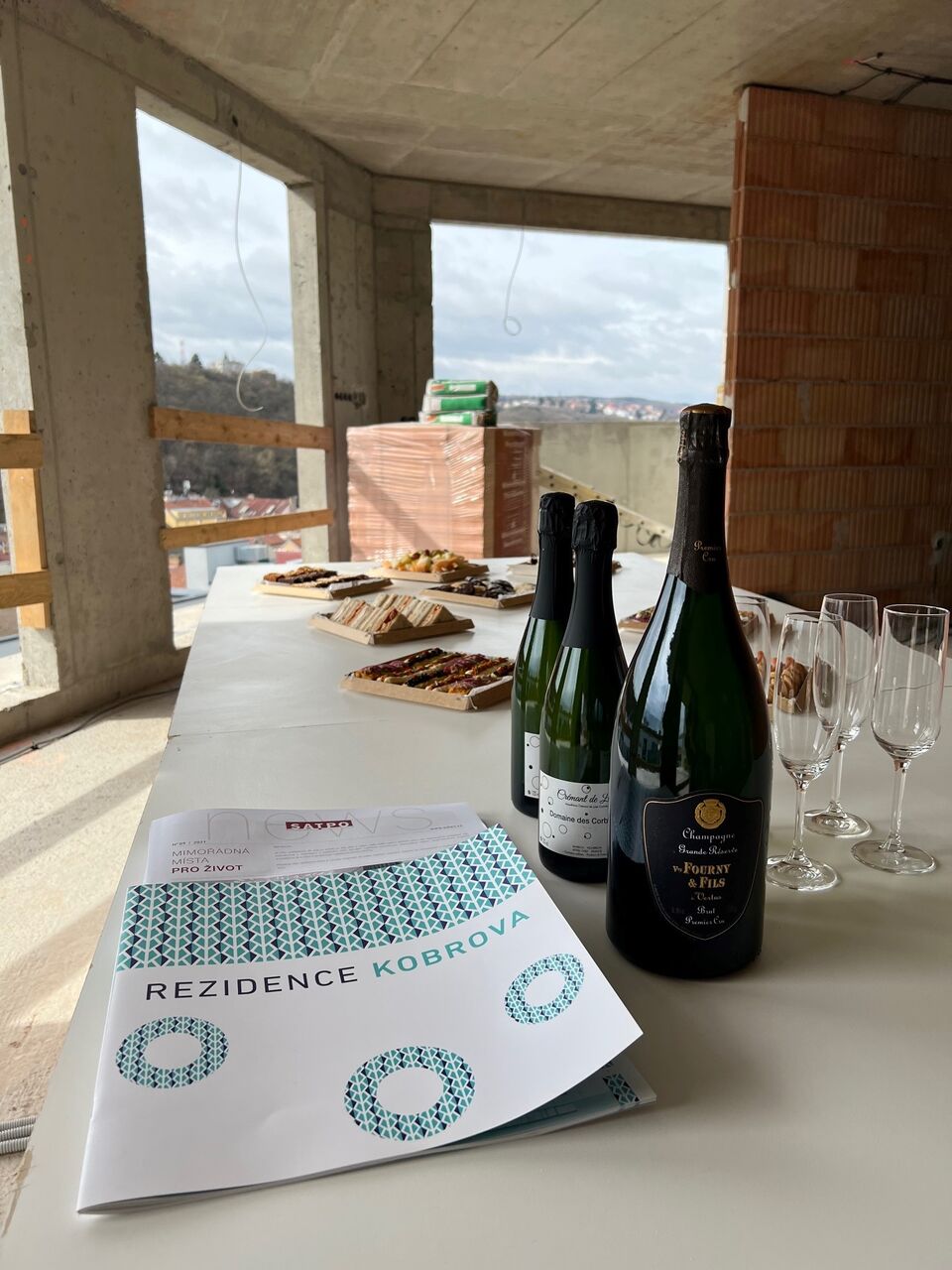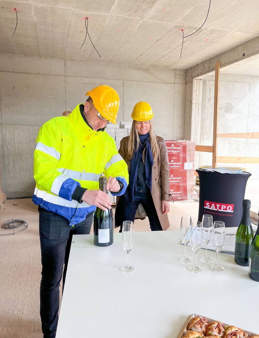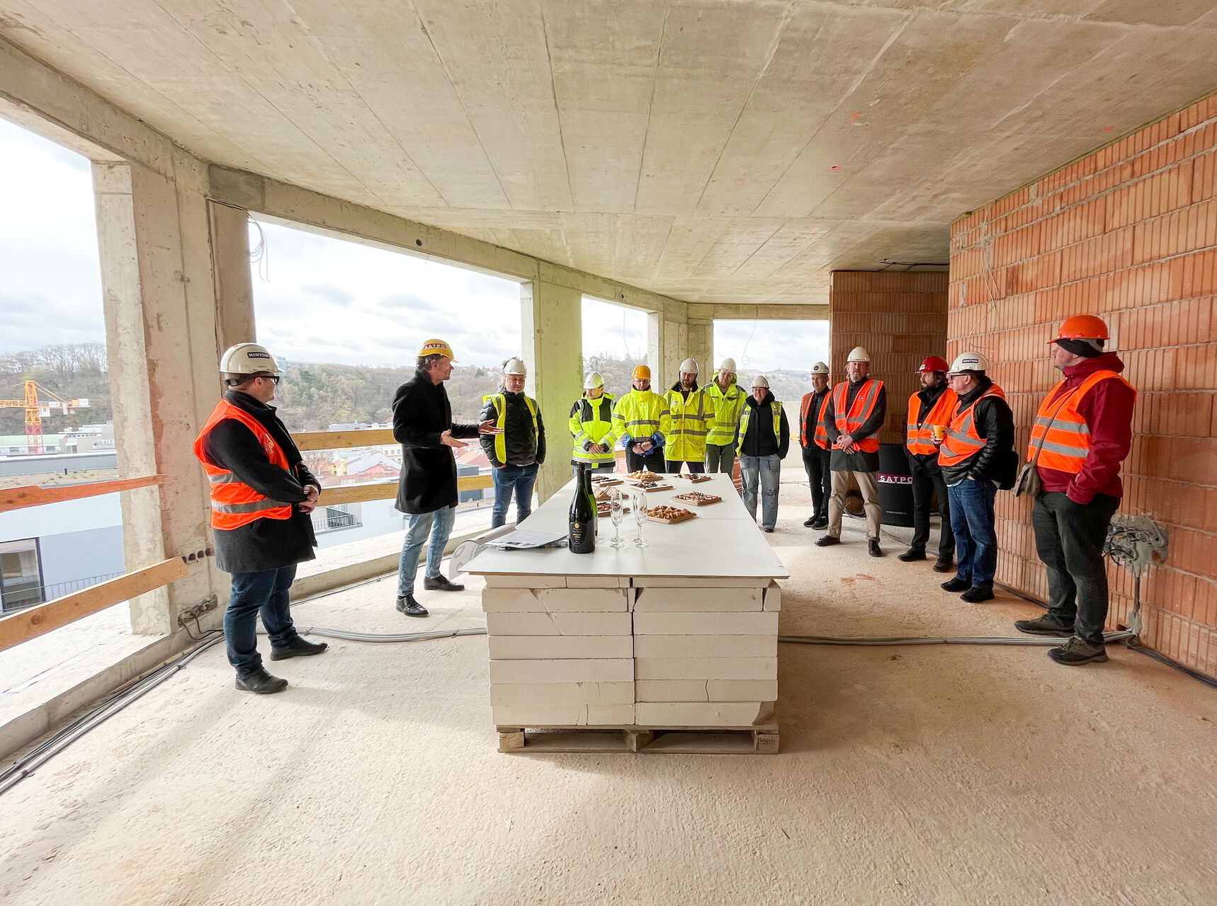 On the occasion of this important stage of construction, representatives of the construction company Hinton, a.s. met on the top floor of Rezidence Kobrova. , designers from the office of AED Project, a.s., the management of SATPO and there was also participation from the studio Schindler Seko Architekti, s.r.o. and financing banks of both Trinity Bank, a.s.