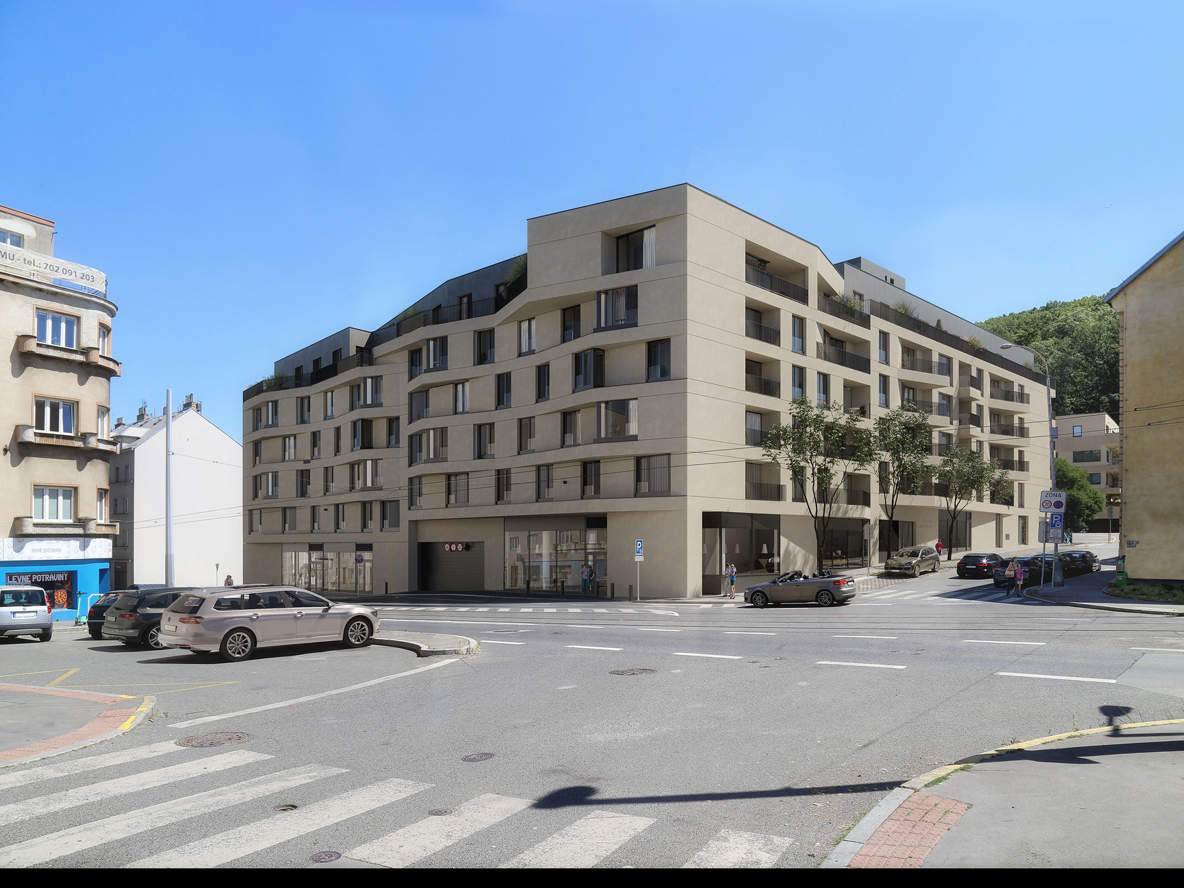 The new building consists of eight above-ground floors and two underground floors with an inserted technological mezzanine. The apartment units are divided into five sections: A to E. Thanks to the proposed street line and facade modulation, the units have eastern sun exposure and a better view along the street arc, partially overlooking Vyšehrad.