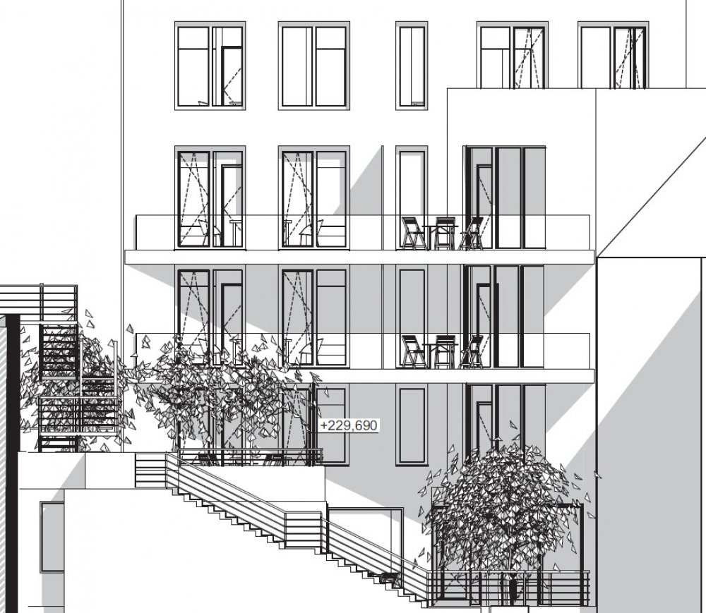 The residential project stands out for the conceptual solution of the apartment units on the ground floor, which have beautiful terraces with a garden in a quiet courtyard. On the top 4th and 5th floor are located separate dwellings with large terraces and amazing views of the center and the courtyard. The layout arrangement meets the highest standards, of course there are large-format windows, bathroom ensuite, entrance wardrobes, technical room and quality finishing materials.
