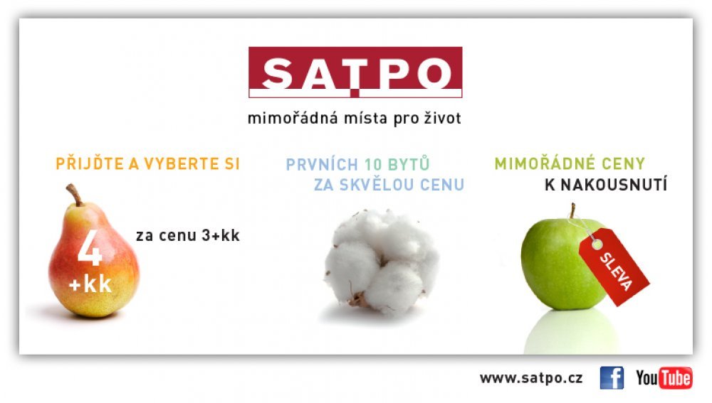 SATPO prepared for you an interesting autumn offer including Visia Imaging gift voucher. Take advantage of the great prices on the first 10 apartments in the Na Malvazinkách Residence or do you select 4 room for the price of 3 in the Jeseniova Residence? The last apartments in Sacre Couer attract with its price to "saucy" as well as a wide selection of timeless living in the Sacre Coeur2 or a royal view of Karlovy Vary. We are an experienced advisor when choosing a new home, we offer a complete service including client changes with a turnkey interiors help and full servises of selling your property. We look forward to your interest and beautiful gossamer wishes, SATPO sales team