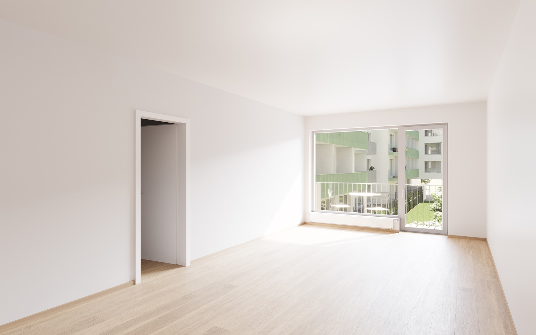 The landscaped courtyard features mature trees, flower beds, and high-quality outdoor furniture. The white and olive-green color palette harmoniously reflects the connection with the surrounding nature.