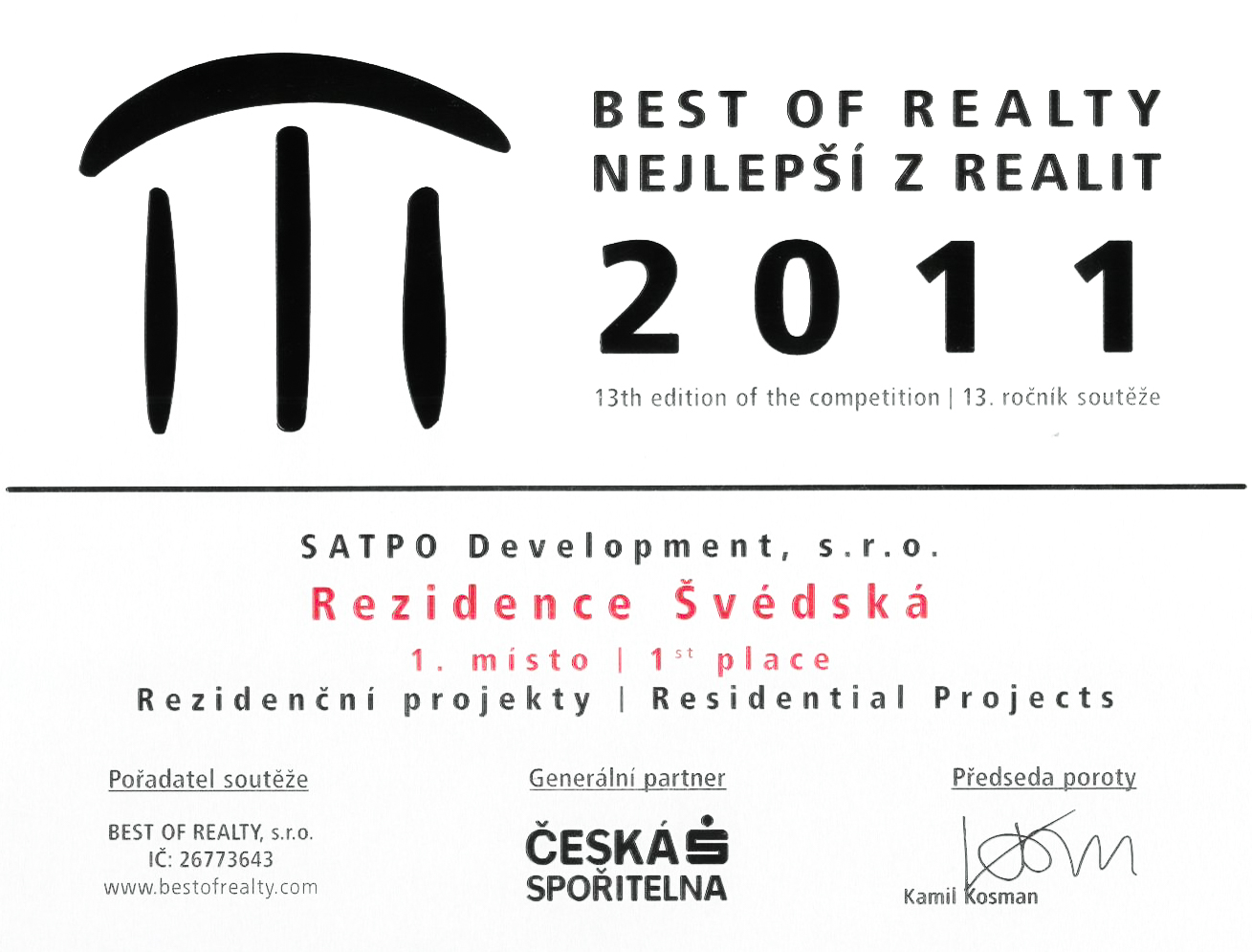Společnost SATPO získala v prestižní soutěži „Nejlepší z realit“ v kategorii Rezidenční projekty 1. místo za projekt Rezidenci Švédská. V této soutěži vybírala odborná porota z 23 kandidátů, příkladem mohou být developerské společnosti jako Finep nebo Trigema.