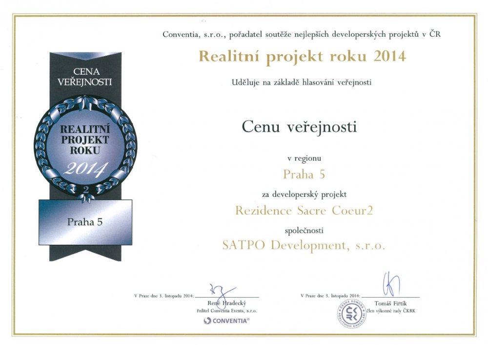 V rámci Realitního kongresu 2014 byly dne 3. 11. 2014 vyhlášeny výsledky soutěže „Czech Real Estate Award 2014“ a společnost SATPO získala za přihlášený developerský projekt Rezidence SACRE COEUR 2 hned dvě ocenění a to CENU ODBORNÉ POROTY a CENU VEŘEJNOSTI v regionu Praha 5.