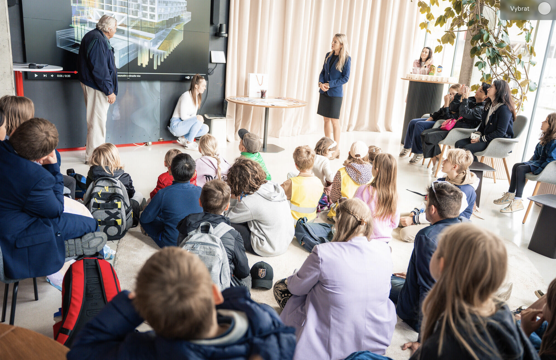Žáci s nadšením poslouchali zkušeného Vlastu Zýku, který jim poutavě představil projekty Rezidence Sacre Coeur 2, Rezidence Vitality, Rezidence Kobrova a Holečkova House.