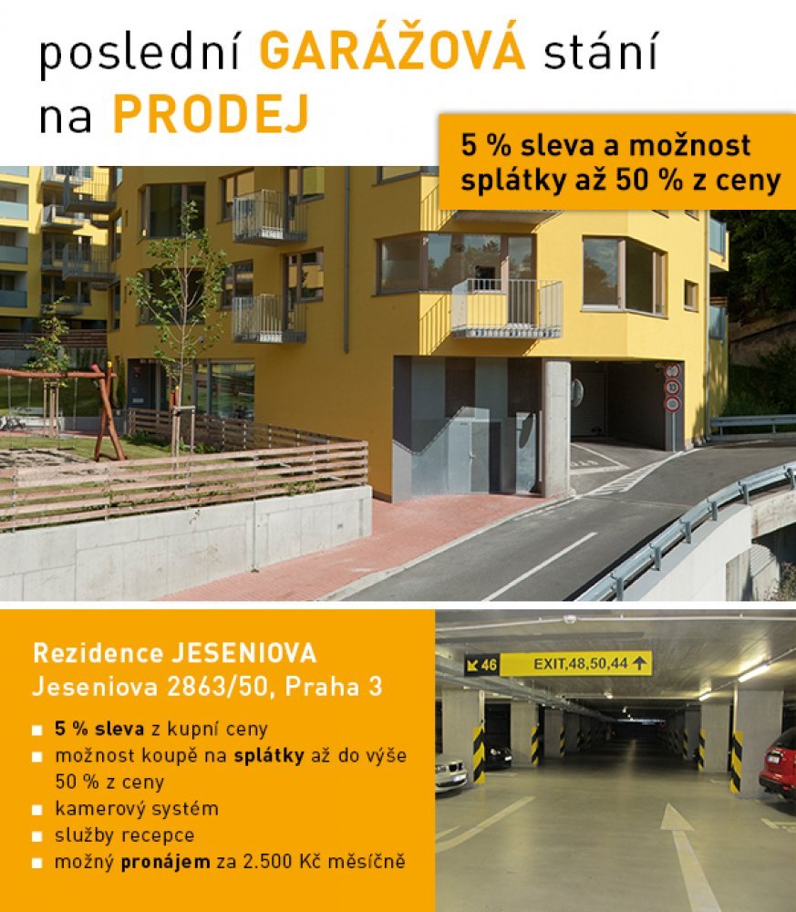 Využijte naší 5 % slevy při nákupu garážového stání v Rezidenci JESENIOVA v ulici Jeseniova 2863/50 na Praze 3. Společně s touto akční nabídkou nabízíme i možnost koupě na splátky až do výše 50 % z ceny. K výběru máme posledních 8 parkovacích míst.