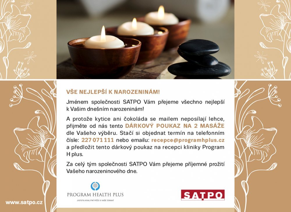 Společnost SATPO ve spolupráci s privátní klinikou Program H Plus předává od minulého týdne do konce roku 2016 majitelům bytových jednotek v Rezidenci Sacre Coeur narozeninové překvapení ve stylu "luxusní cesta ke zdraví", která představuje pozvánku na 2 fyzioterapeutické masáže.