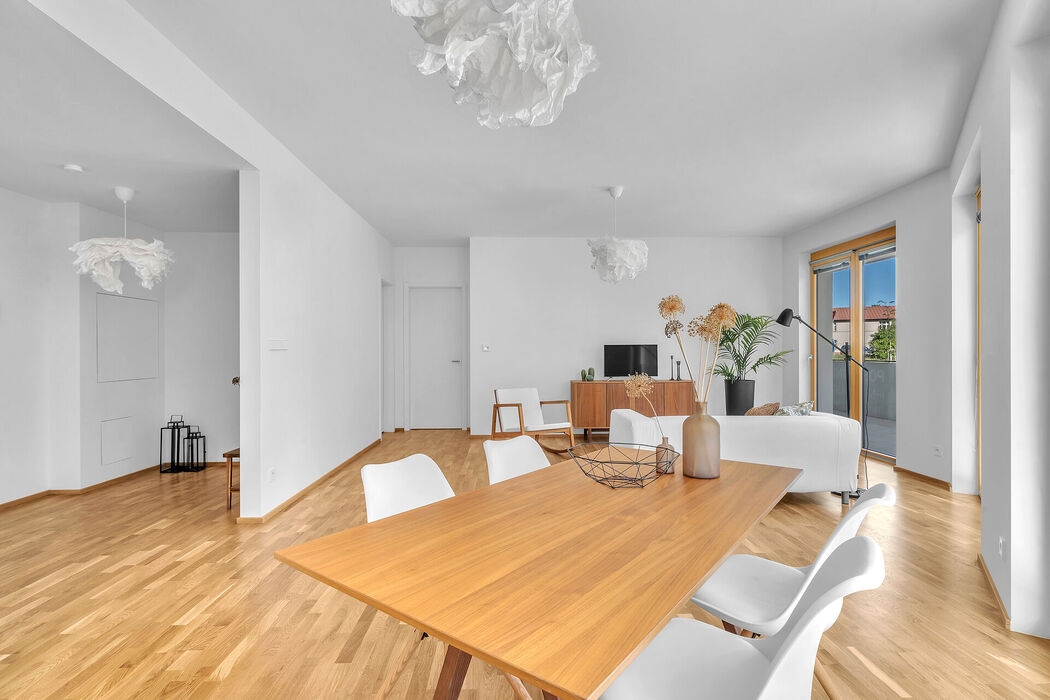Slunný a moderní byt o velikosti 114,5 m² se skládá z obývacího pokoje s kuchyňským koutem, dvou ložnic, vstupní haly a prostorná terasy (13 m²), která nabízí příjemné venkovní posezení. Ložnice mají ensuite koupelny s WC, další toaleta je přístupná z obytné části bytu. V ceně nemovitosti je sklep 5,5 m² a garážové stání.