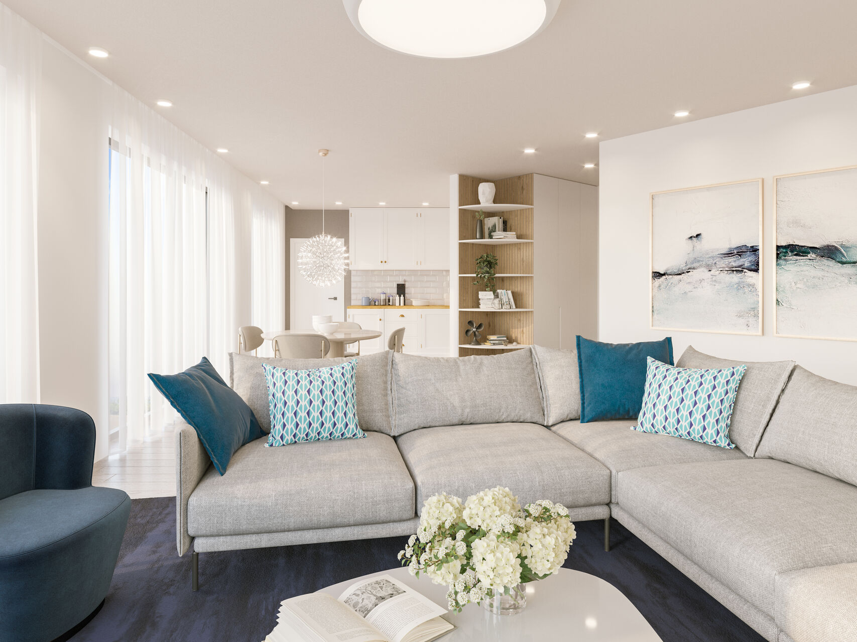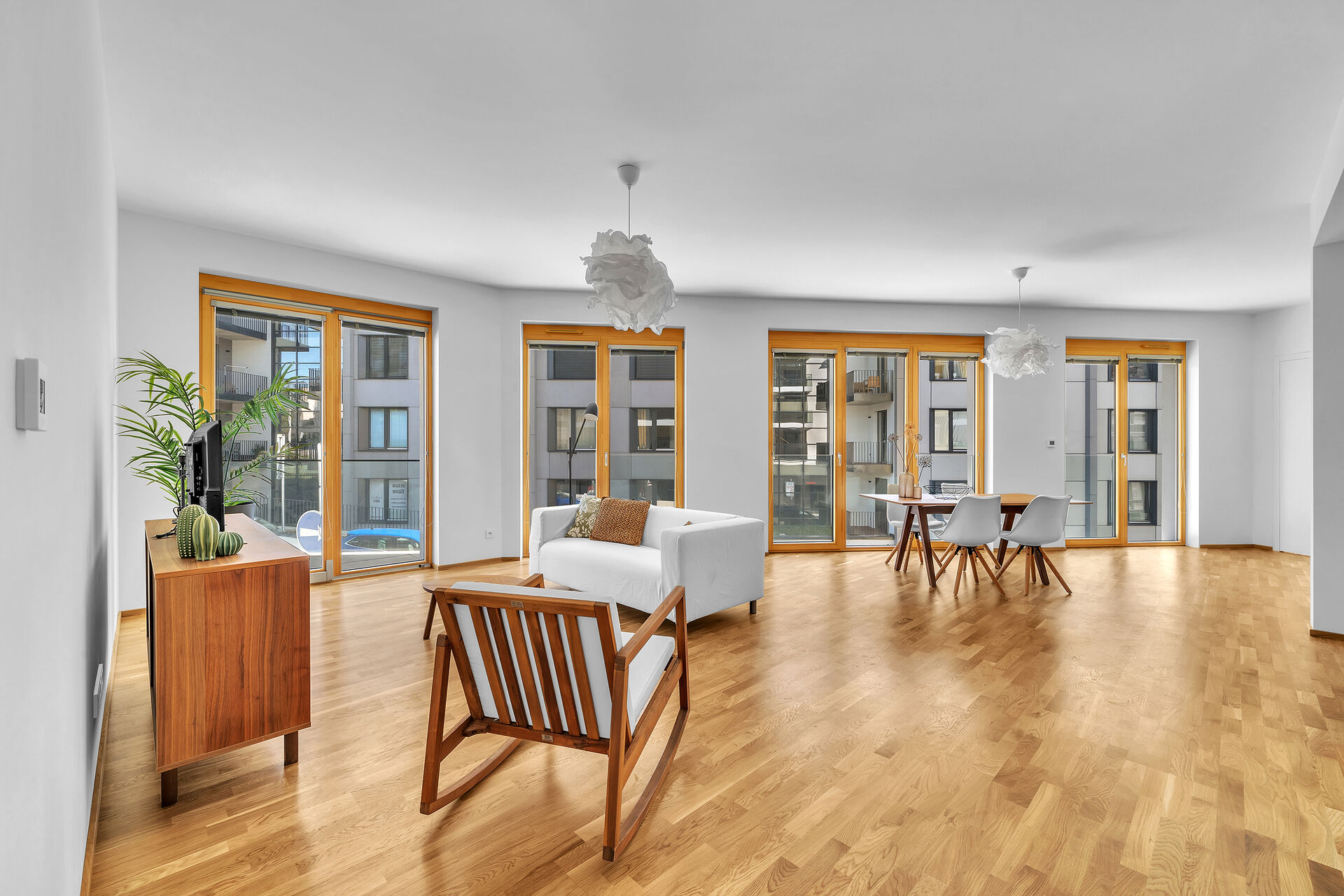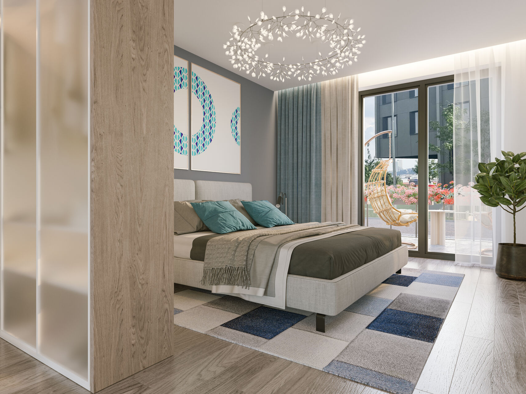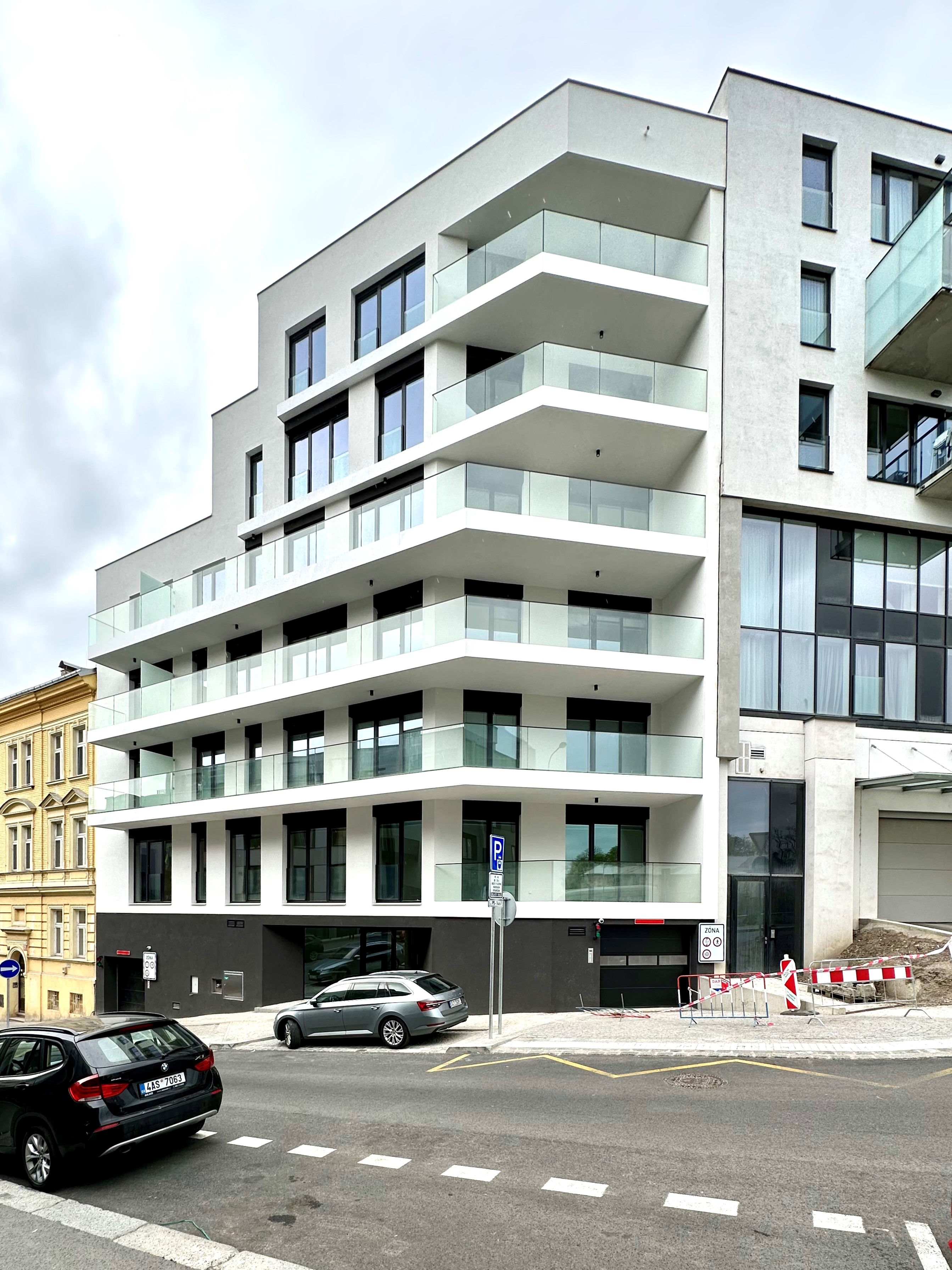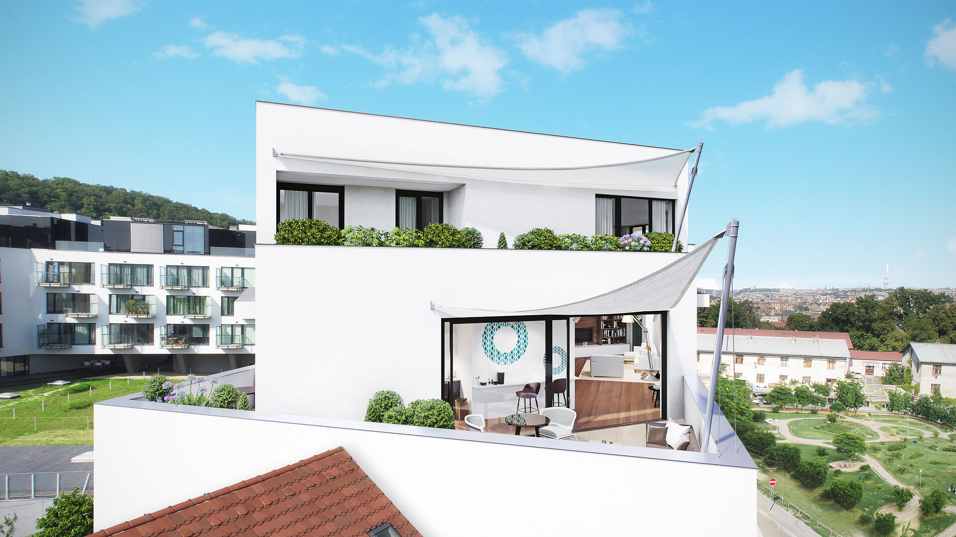Architektonický návrh představuje ideální kombinací funkčnosti, elegance a nadčasového vzhledu, velký důraz je kladen na vysokou kvalitu finálního dokončení. Kompozice tvarového, materiálové a barevného řešení působí klidným dojmem a neutrálně. Velkoformátová okna a slunné terasy vtáhnou klidné městské bydlení do interiéru každé bytové jednotky.