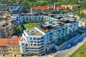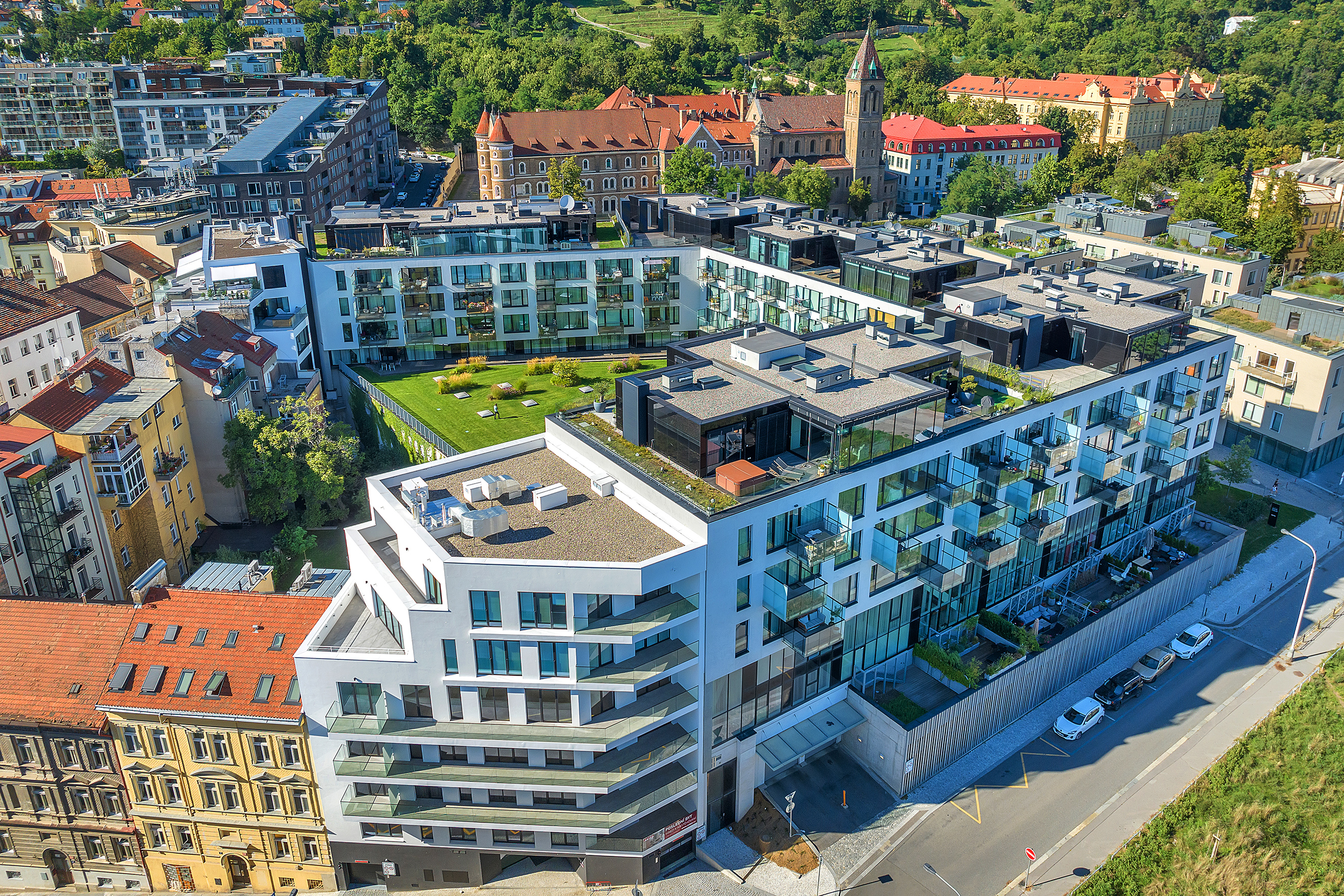 Velkou předností této novostavby jsou zeleně situované ve vnitrobloku. Jedná se o střešní zahrady s kombinací prostorných teras před vstupy do jednotlivých bytových jednotek, které vytváří klidné místo určené k odpočinku.