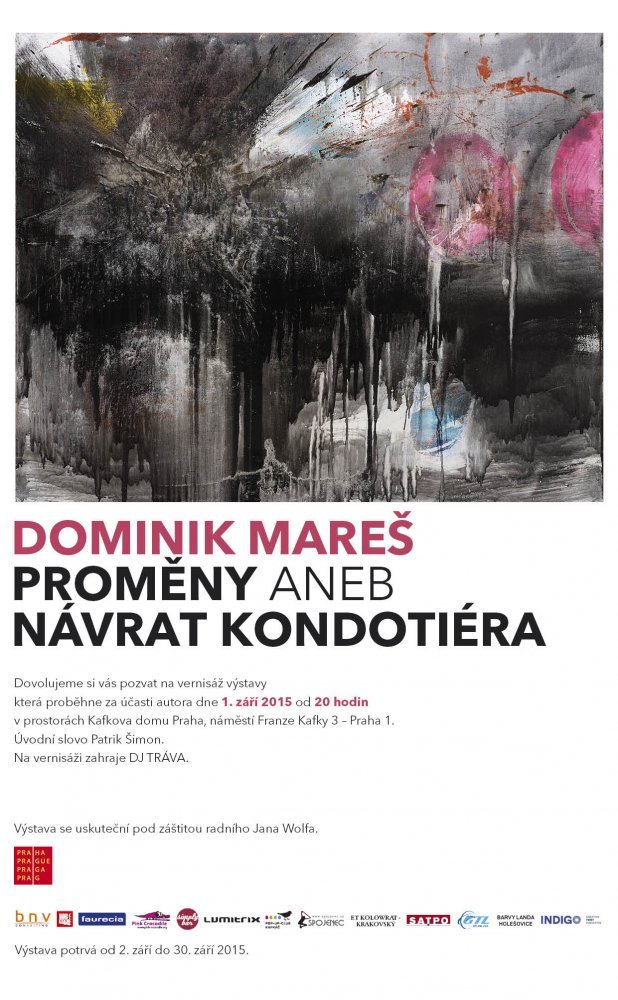 S potěšením jsme se 1. září 2015 zúčastnili vernisáže výstavy „Proměny aneb návrat Kondotiera“ v Kafkově domě, který se nachází vedle Staroměstského náměstí a Pařížské ulice. Zjistěte více o umělci Dominiku Marešovi.