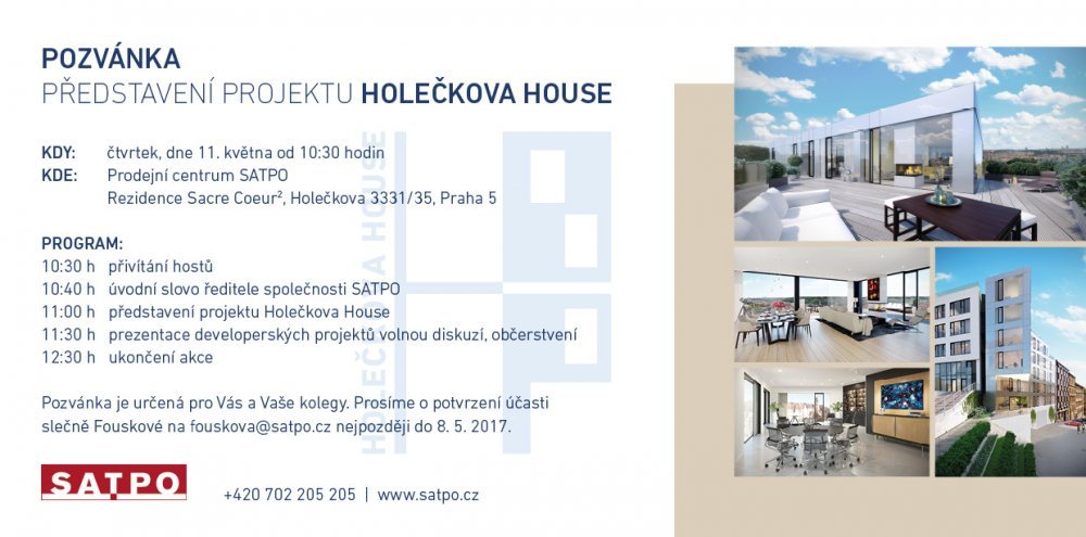 Tisková konference nového developerského projektu Holečkova House se uskutečnila 11. května 2017 od 10:30 hodin v našem nově otevřeném SATPO prodejním centru přímo v Rezidenci Sacre Coeur 2 na pražském Smíchově.